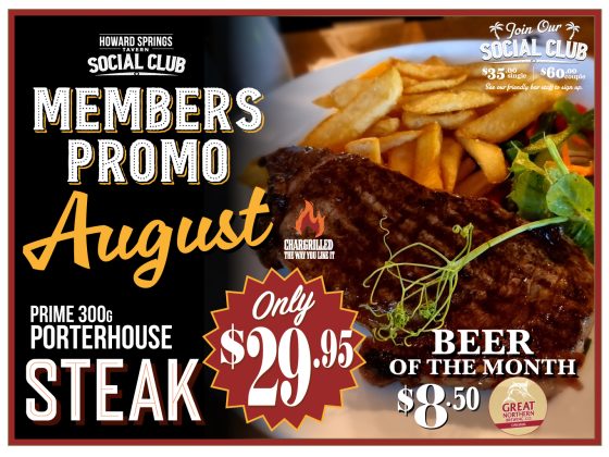 Only 23 kilometers south of Darwin and right on the doorstep of the Kakadu and Litchfield National Parks, Howard Springs Tavern is one of the region’s favourite spots. The whole family can enjoy the great atmosphere of our Bistro for lunch from 12 til’ 2, or dinner from 6 til’ 8:30. Our relaxing beer garden is also on offer so you can enjoy an ice cold drink or bar snacks outdoors. Our value-for money meals are famous in the region and there’s a playground to keep the kids happy. Our Sports bar caters for all tastes in sport, and features two extra large screens so you can see all the action. We also have full TAB facilities, plus Keno and pokies, so sports fans are well catered for.