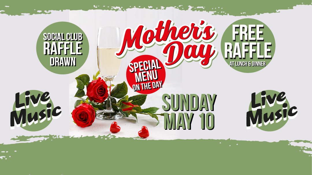 Celebrate Mum's everywhere. Special menu for the day. Free raffle. Social Club raffle drawn. Free glass of Champagne for mothers with a meal purchase. :ive Music from Scott Murphy 1-5pm.